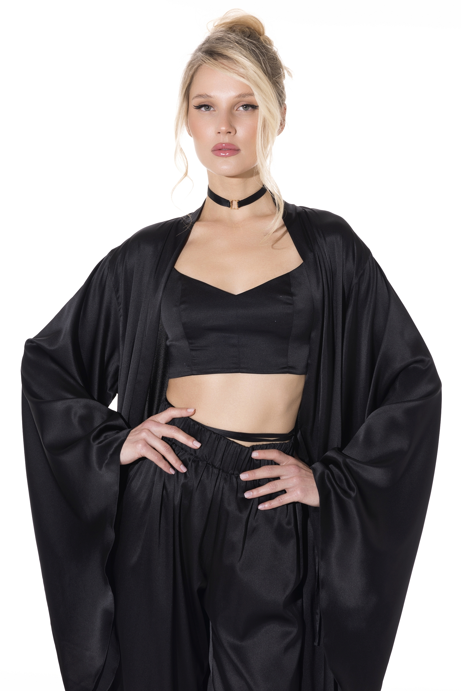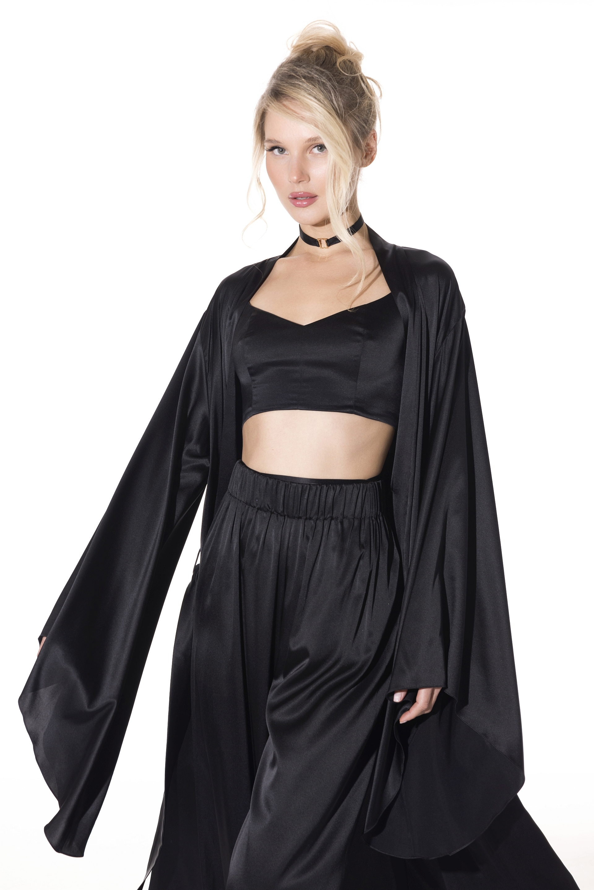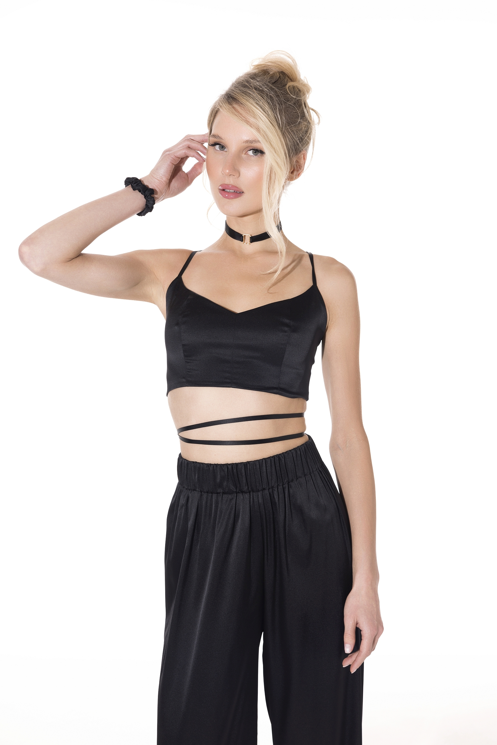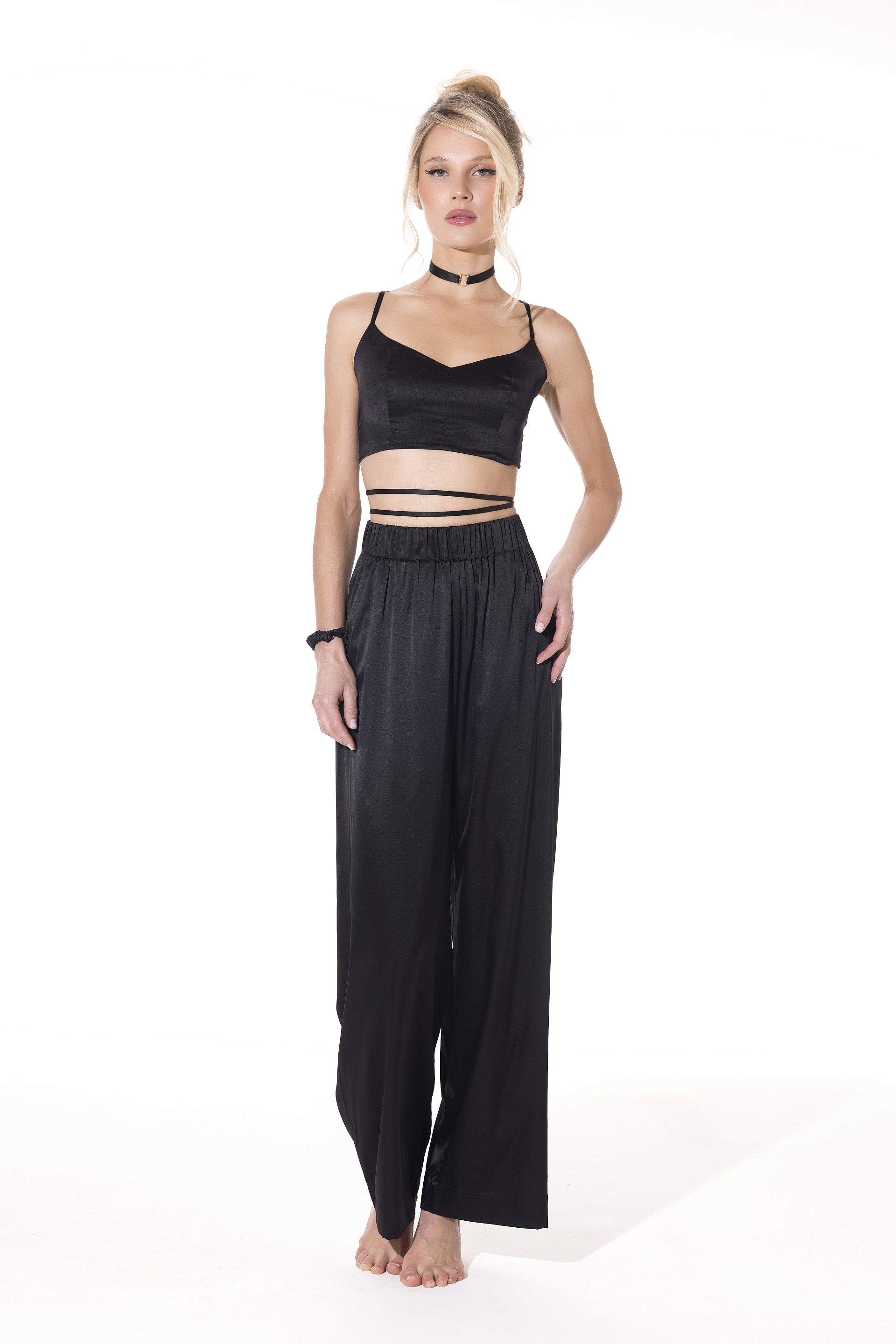 Изделие дополнено длинными шёлковыми завязками, которые выполняют конструктивную функцию фиксации топа. Завязки позволяют варьировать способы завязывания без изменения посадки изделия: их можно располагать по талии, перекрещивать по спинке или выводить выше, вплоть до уровня шеи, формируя разные стилистические решения при сохранении стабильной конструкции.